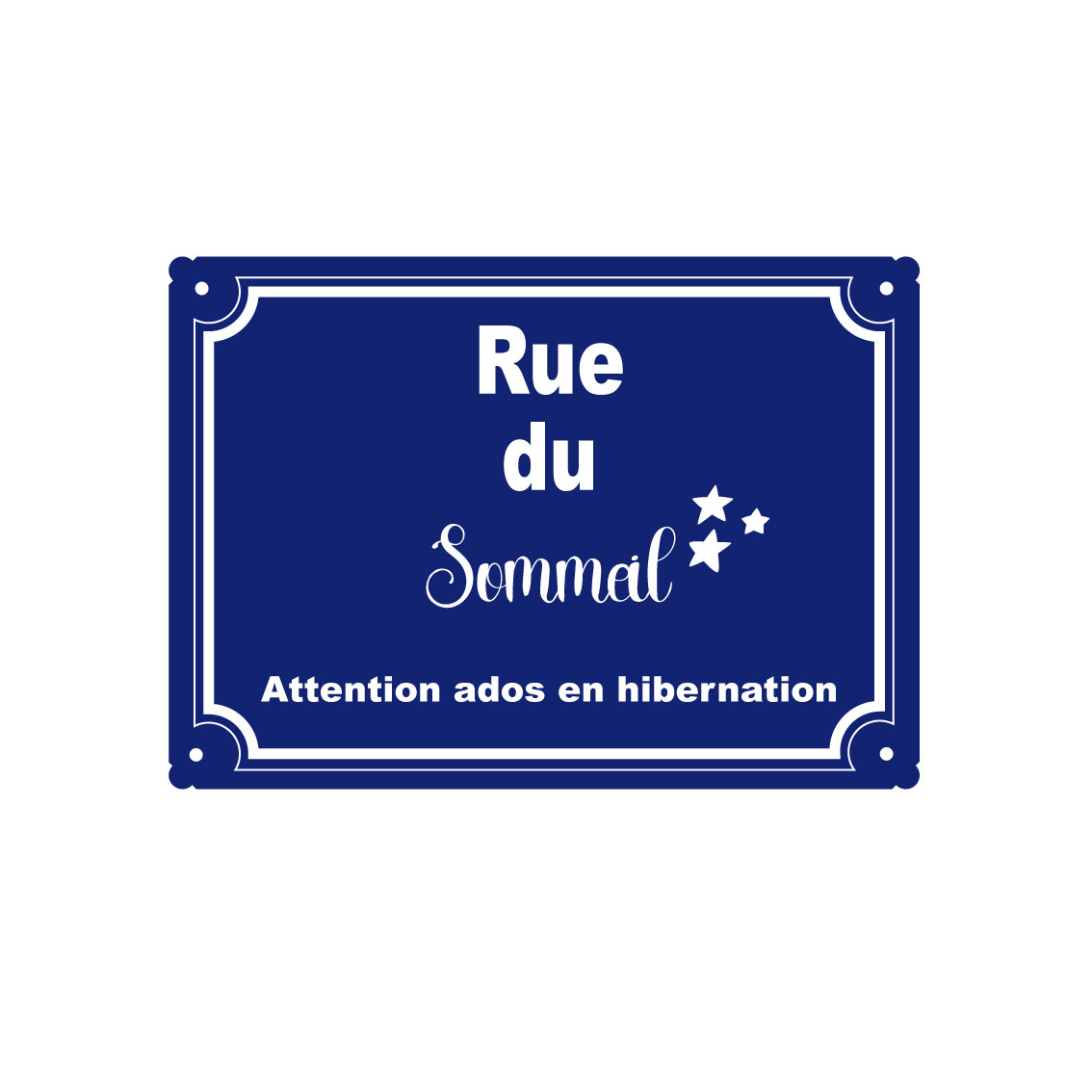 Plaque métal humoristique. Rue du sommeil. Attention ados en hibernation.