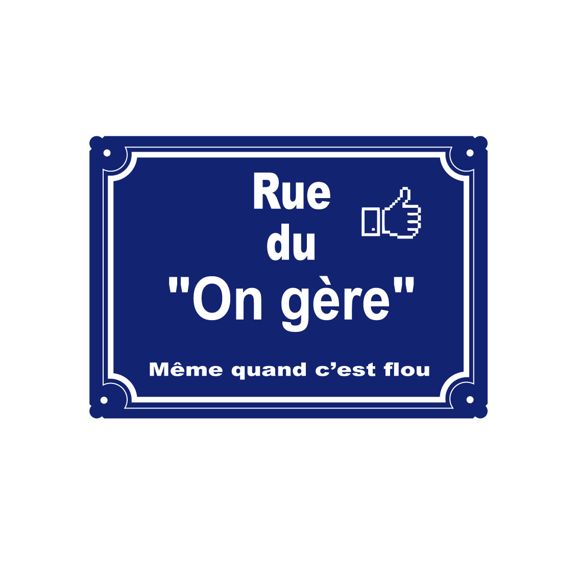 Plaque métal humoristique, Rue du "on gère". Même quand c'est flou.