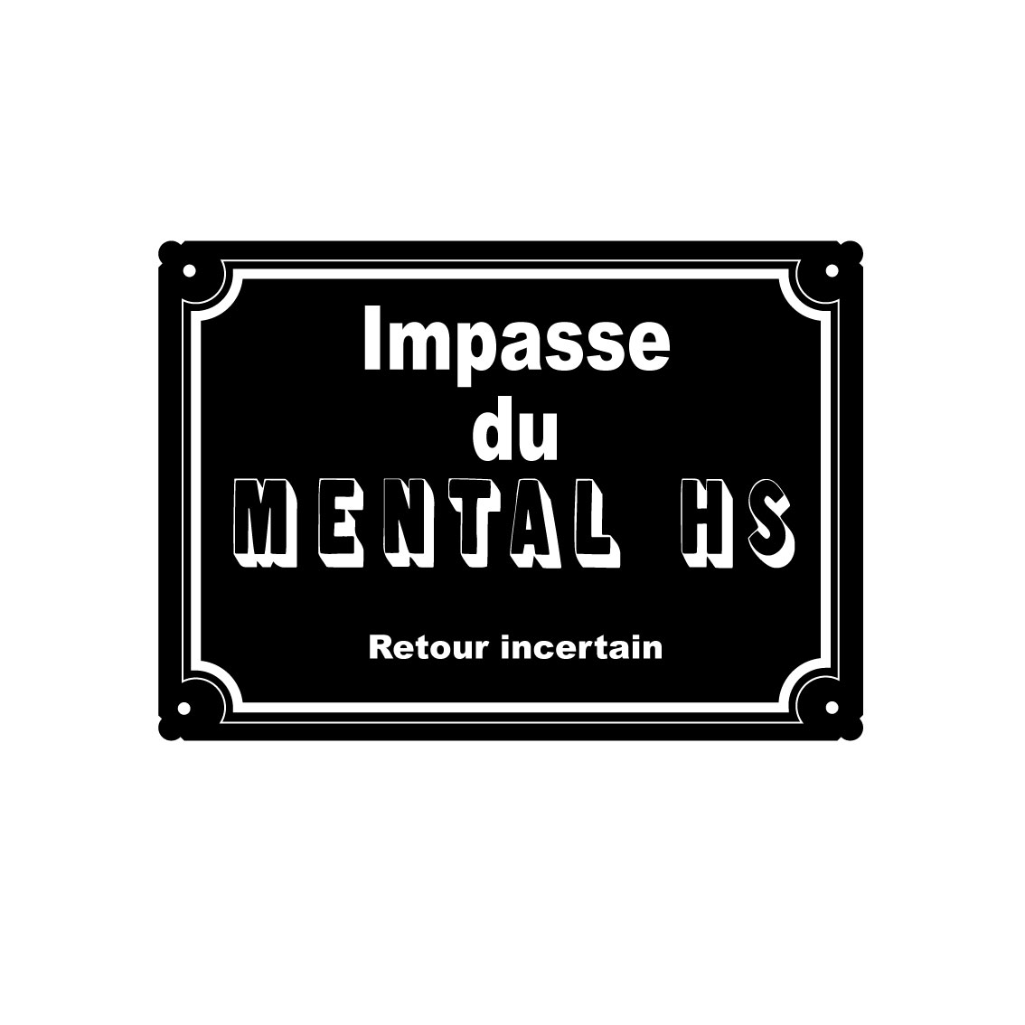 Plaque métal humoristique. Impasse du mental HS. Retour incertain.