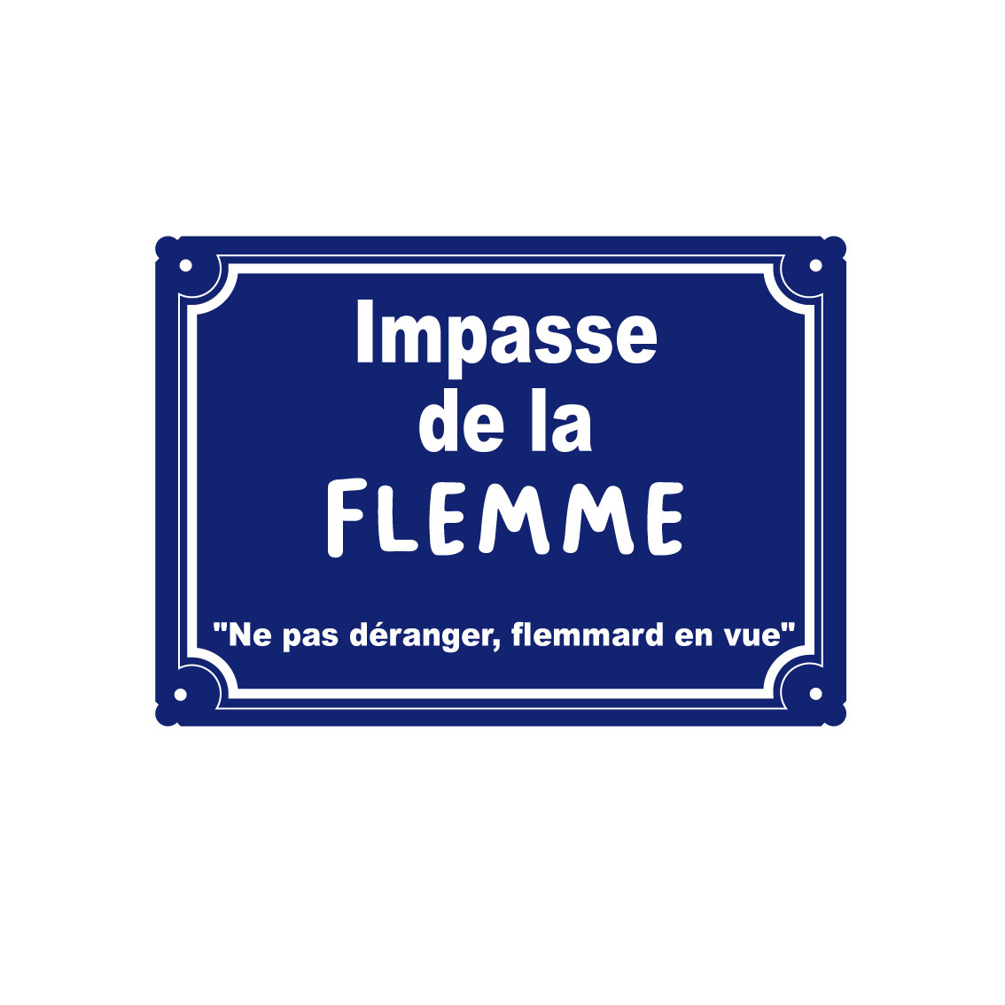 Plaque métal humoristique. Impasse de la flemme. Ne pas déranger, flemmard en vue.